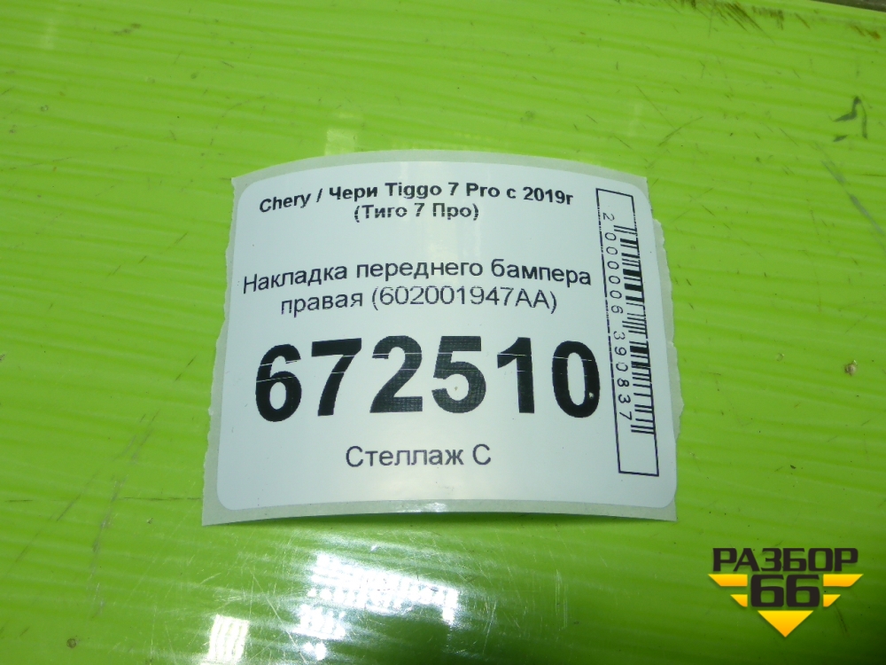 Накладка переднего бампера правая (602001947AA) для Chery Tiggo 7 Pro с 2019г (Тиго 7 Про) в Екатеринбурге