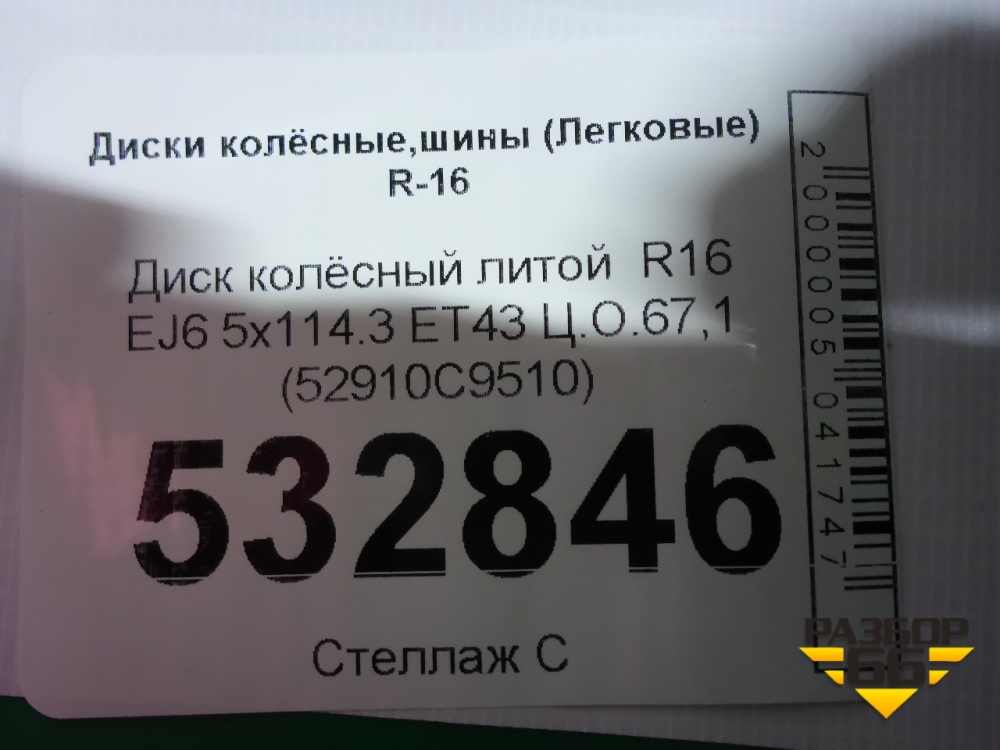Диск колёсный литой R16 EJ6 5x114.3 ET43 Ц.О.67,1 (52910C9510) в Екатеринбурге