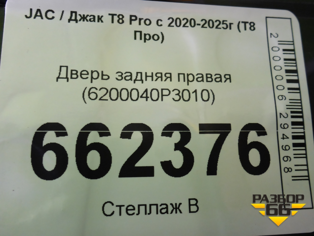 Дверь задняя правая (6200040P3010) для JAC T8 Pro с 2020-2025г (Т8 Про) в Екатеринбурге