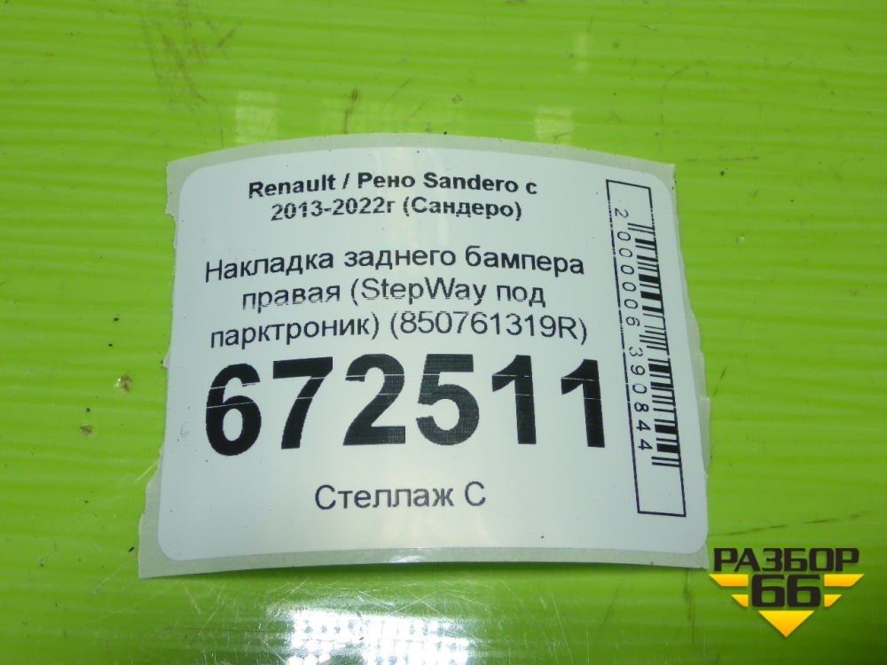 Накладка заднего бампера правая (StepWay под парктроник) (850761319R) для Renault Sandero с 2013-2022г (Сандеро) в Екатеринбурге