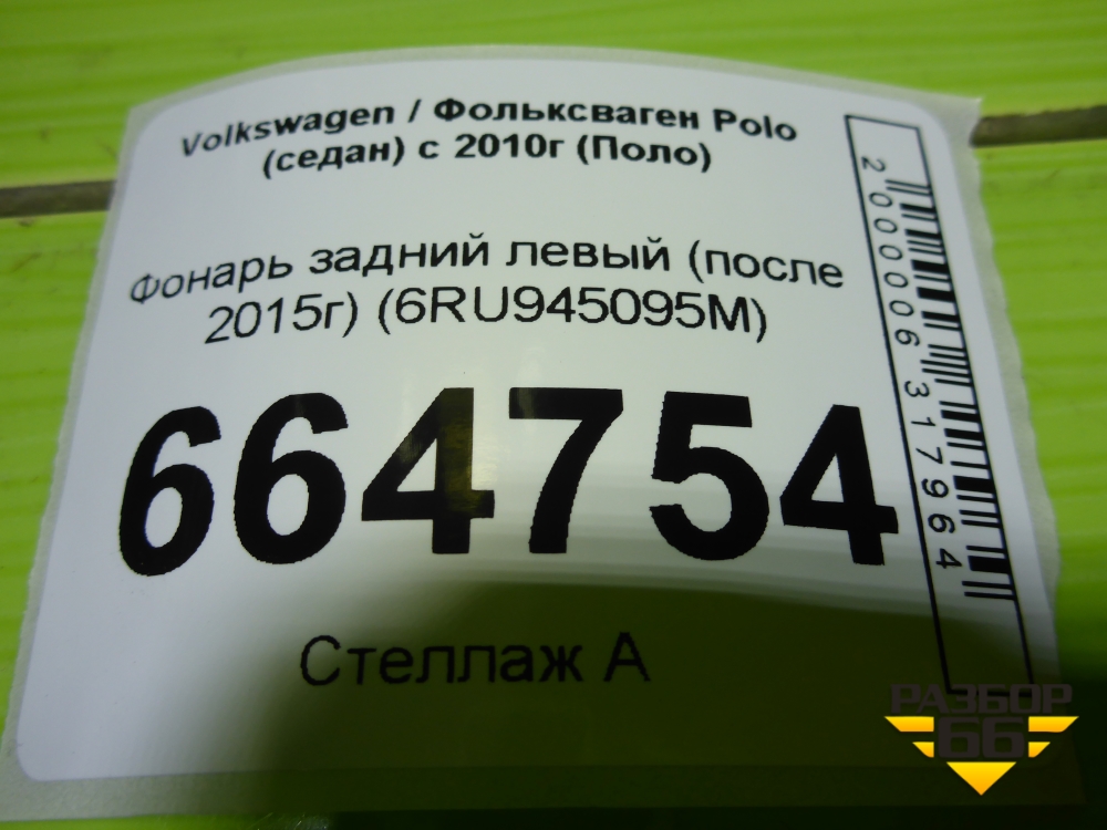 Фонарь задний левый (после 2015г) (6RU945095M) для Volkswagen Polo (седан) с 2010г (Поло) в Екатеринбурге