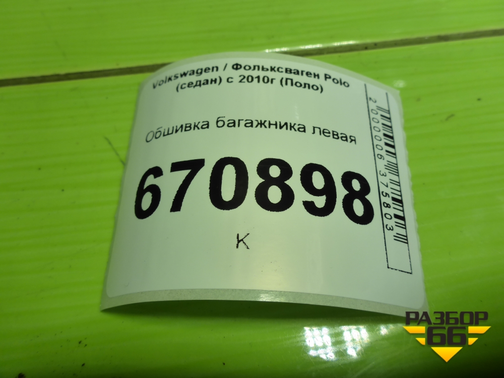 Обшивка багажника левая для Volkswagen Polo (седан) с 2010г (Поло) в Екатеринбурге