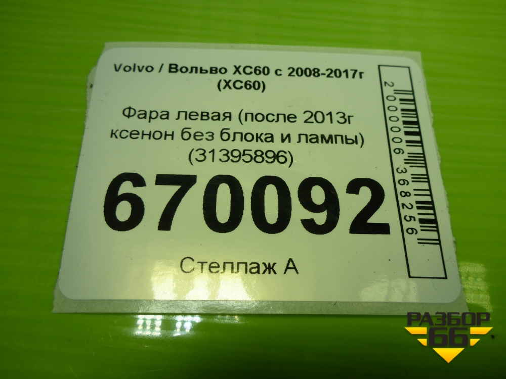 Фара левая (после 2013г ксенон без блока и лампы) (31395896) для Volvo XC60 с 2008-2017г (ХС60) в Екатеринбурге